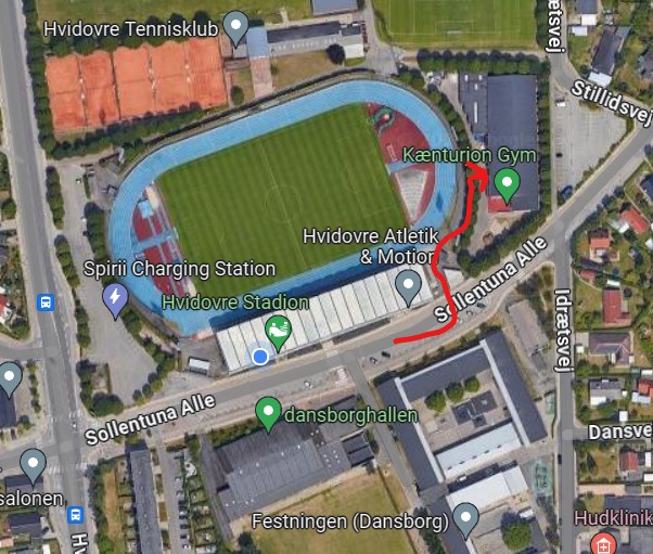 Når vi har passeret efterårsferien og frem til påske er vi indendørs i vores atletikhal. Her har vi også mulighed for at være hvis det skulle regne om sommeren. Hallen ligger til højre for tribunen (set fra gaden)